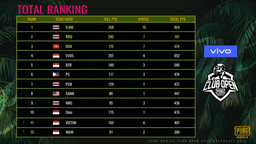 Klasemen Sementara peringkat 1-12 PUBG Mobile Club Open PMCO SEA League 2019 Shanghai hari kesepuluh, Minggu (19/5/2019).-YOUTUBE